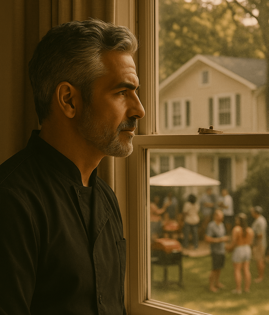 A middle-aged man with salt-and-pepper hair and a trimmed beard, wearing a black chef’s jacket, stands by a window looking out thoughtfully at a backyard barbecue across the street. Warm evening light filters through the glass, softly illuminating his face as people gather and talk around a grill outside.